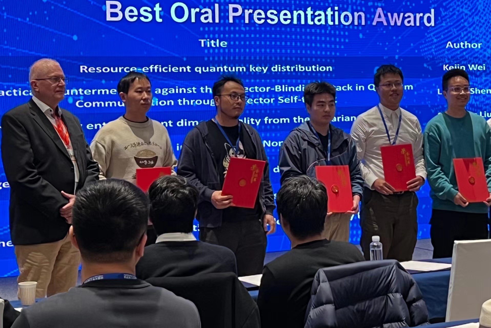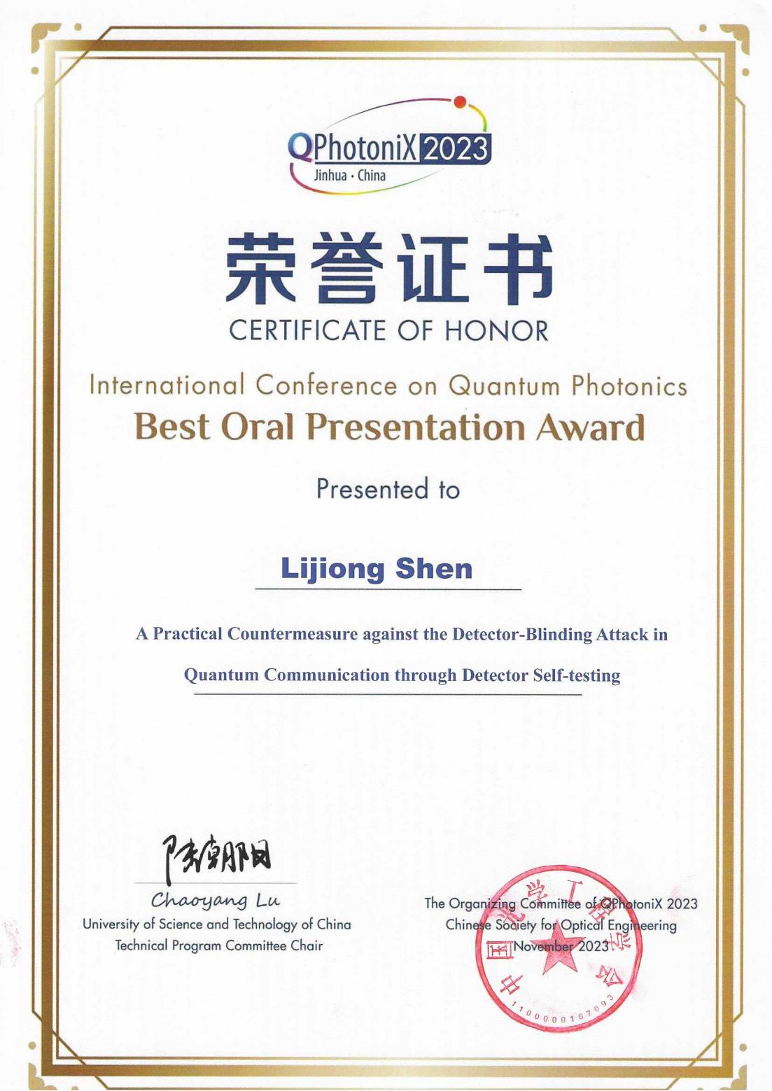 会议期间,共有600余位专家围绕量子光子学的各个方面进行了深入交流和探讨。在最佳口头报告奖的评选中,熊猫体育 专任教师沈李炯老师的报告《A Practical Countermeasure against the Detector-Blinding Attack in Quantum Communication through Detector Self-testing》脱颖而出,荣获最佳口头报告奖。沈李炯老师在报告中深入浅出地介绍了如何利用低成本和实用的方法抵御量子通讯中对探测器端的攻击,为量子通信的安全性提供了有力保障。