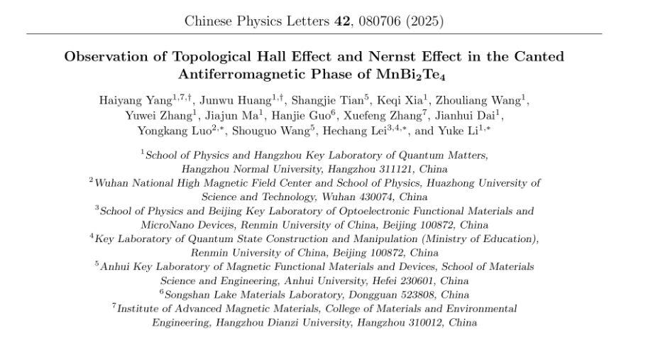 研究意义和重要性:首次在MnBi2Te4这一典型的反铁磁拓扑绝缘体中同时观测到了THE与TNE,并揭示了非共线自旋结构所诱导的真实空间Berry曲率在磁输运中的关键作用。研究结果不仅丰富了我们对磁性拓扑材料中Berry曲率来源与输运机制的认识,也为未来基于反铁磁拓扑材料的自旋电子学与热电器件设计提供了重要的实验依据与理论启发。