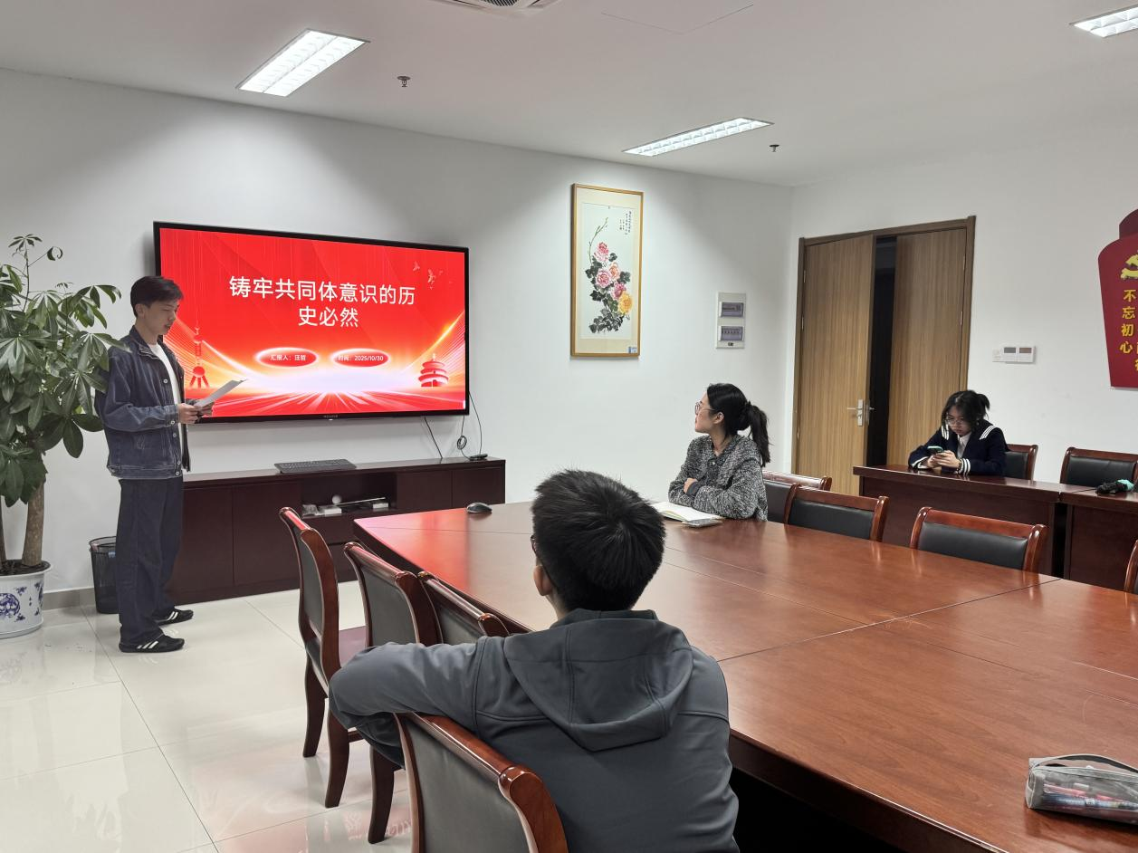 活动中,汪哲同学以《铸牢共同体意识的历史必然》为题,从多个维度,深入阐释了中华民族共同体形成的必然性与时代价值。他通过生动详实的案例,展现了中华民族深厚的底蕴,号召全体党员从历史中汲取力量,在行动中践行使命,积极投身于民族团结与伟大复兴的实践中。