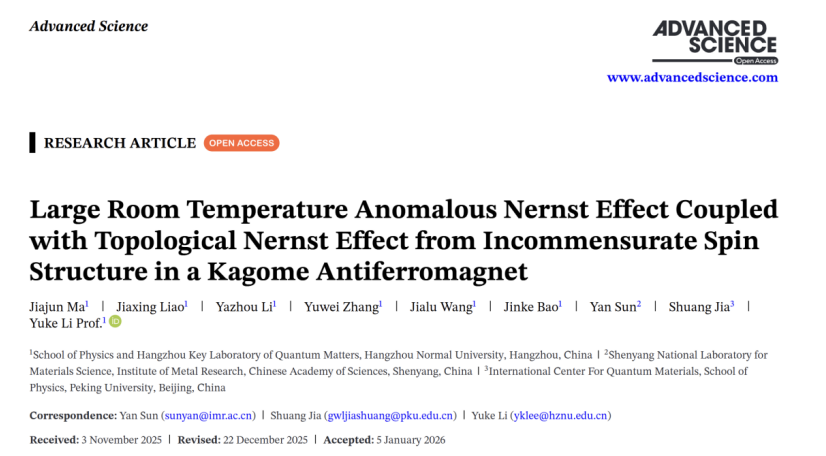 本工作首次发现,Kagome 反铁磁体 ErMn₆Sn₆ 在面外磁场调控下可产生巨大的室温反常能斯特效应(1.38 μV/K),其信号强度超过多数拓扑铁磁体;同时观测到,体系非公度反铁磁序诱导的拓扑能斯特效应与反常能斯特效应存在强耦合现象。该研究成功解析了动量空间贝里曲率与实空间自旋手性这两种拓扑机制在同一体系中的共存与交互作用,为理解具有非公度自旋织构的复杂磁性量子材料中的拓扑输运现象提供了全新范例。