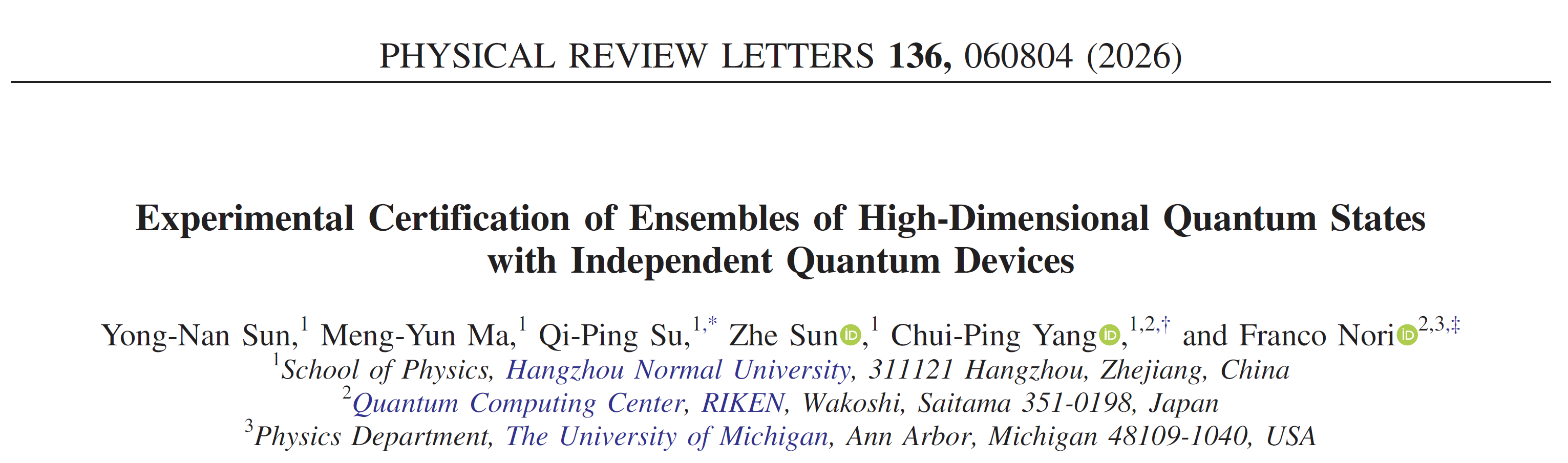 通讯作者:杨垂平 共同通讯作者:苏奇平,Franco Nori